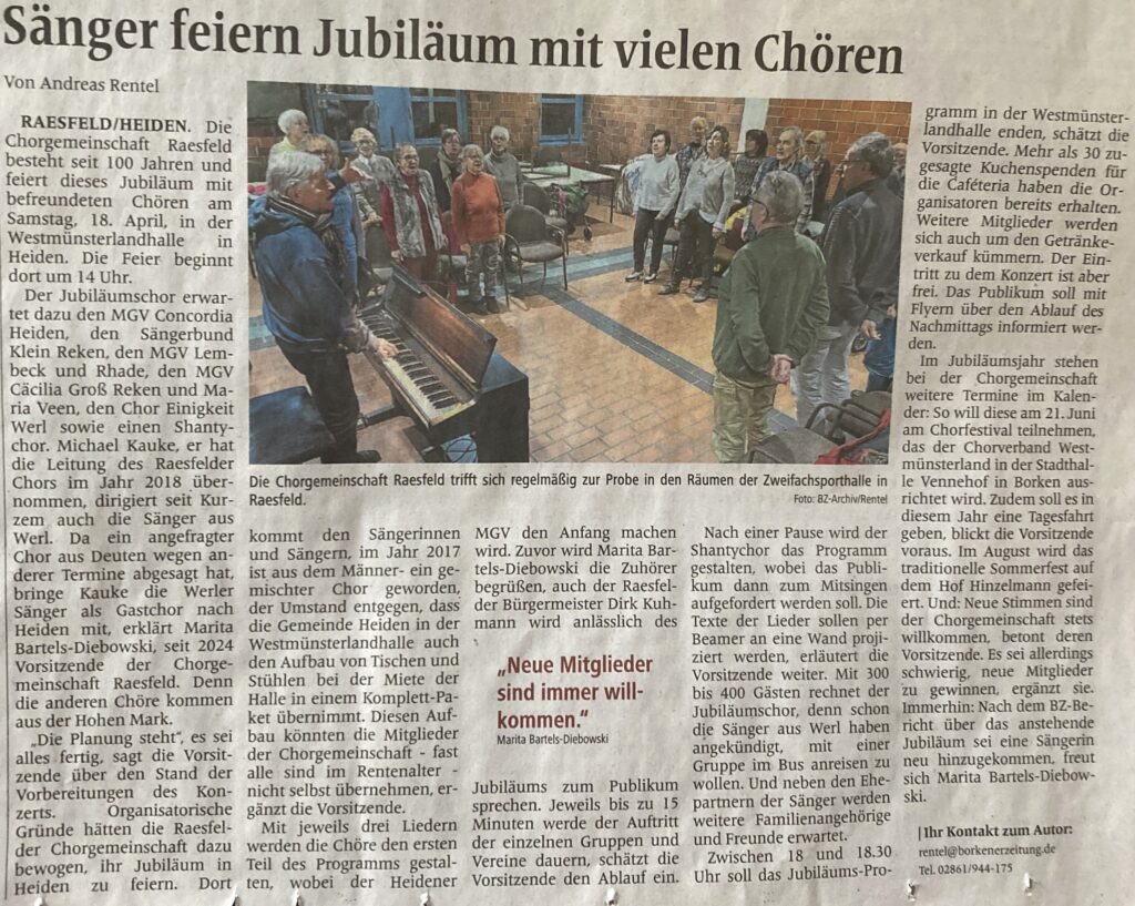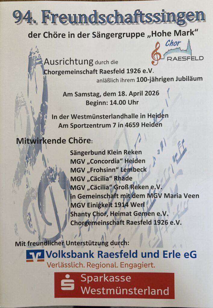 Ein wichtiges Ereignis findet am 18. April 2026 statt. Die Chorgemeinschaft Raesfeld 1926 e.V. richtet das Hohe-Mark-Singen in Heiden - Westmünsterlandhalle aus und feiert gleichzeit das 100-jährige Bestehen.
